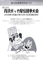 大倉(どんぐりハウス下)をスタートし、走路を5区間に分けて、大倉尾根と鍋割山稜を経て、鍋割山荘へゴール。32チームの参加にて開催。飲料水をボッカの負荷とし、10Kg・20Kg・40kgの3クラスで競技した。